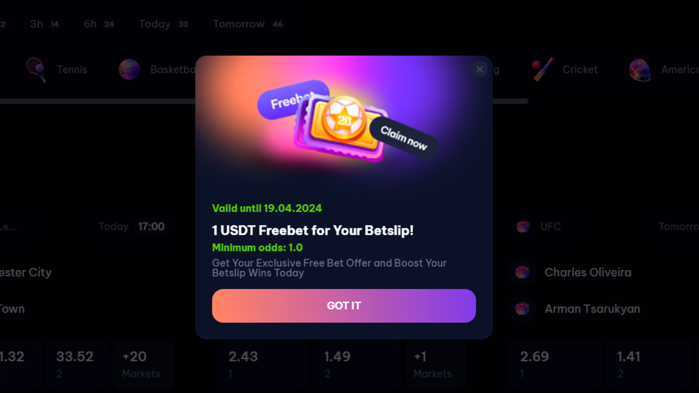 Example: Receiving a $10 FreeBet allows you to place a wager of 10 USDT.
